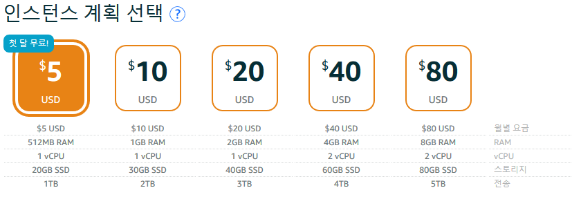 월 5$ 면 호스팅을 512MB RAM 20GB SSD 1TB 트래픽을 제공 받을 수 있고,