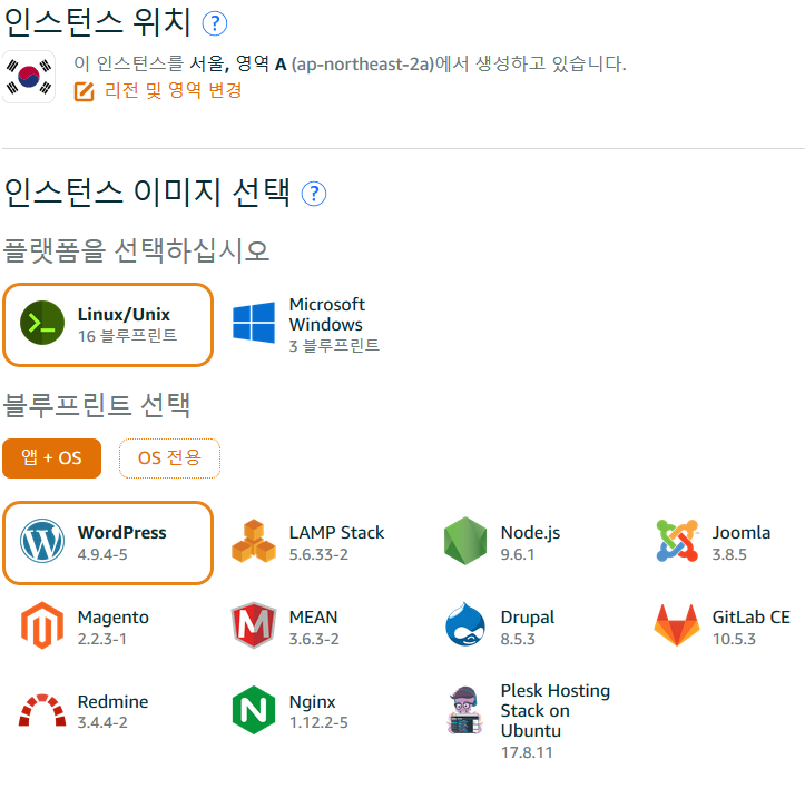 인스턴스를 생성할 리전과 서비스를 설치하고 앱+OS를 제공해주는 인스턴스 이미지를 선택하여 목록에서 Wordpress 를 선택해주면 생성이 끝난다.