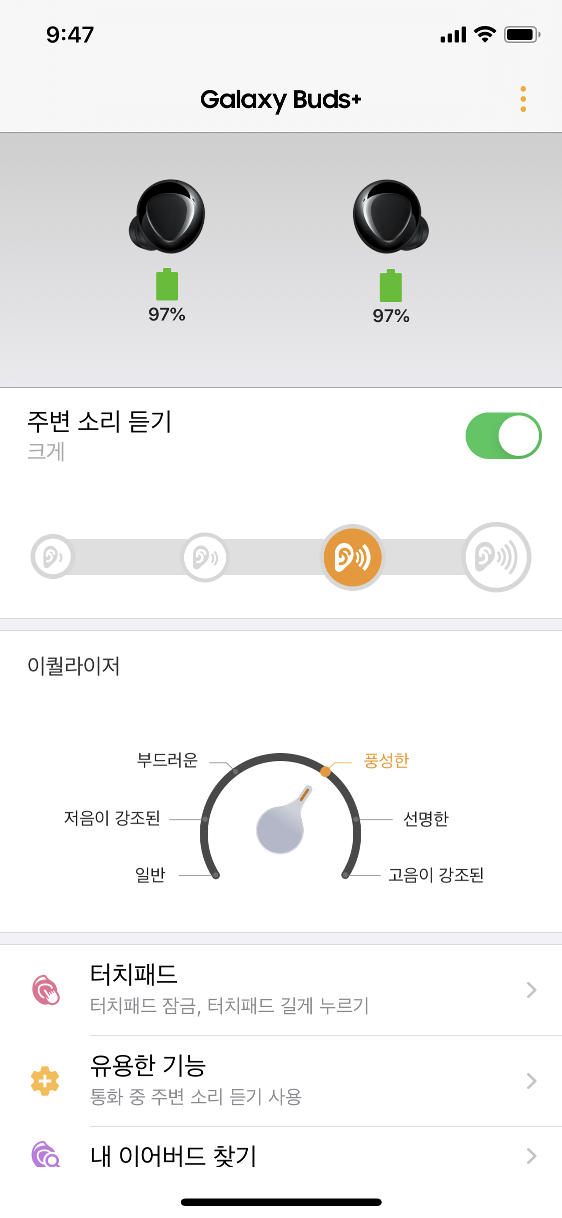 이제는 아이폰에서도 전용 앱으로 음질, 터치 설정 등을 할 수 있게 돼서 아이폰 유저로써는 제일 체감되는 개선점이라고 생각된다.