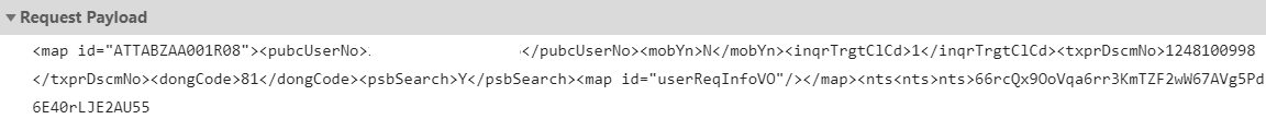 통신구간을 분석하기 위해 웹브라우저의 개발자도구를 사용하여 요청하는 URL과 Request Data를 확인해 보았다. 사업자 등록번호는 삼성전자의 사업자등록번호를 사용해 조회를 했다.