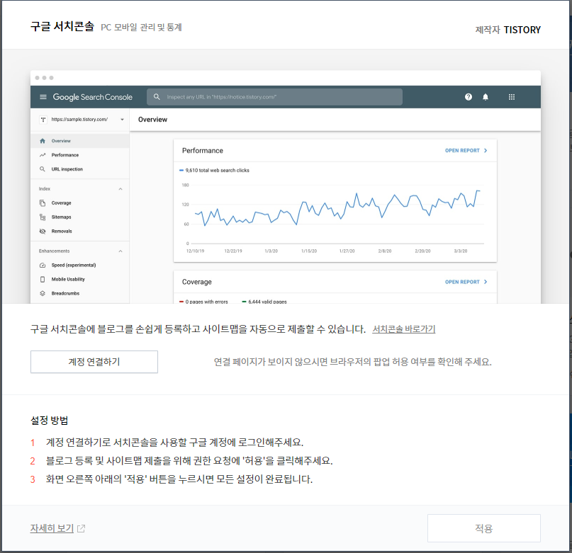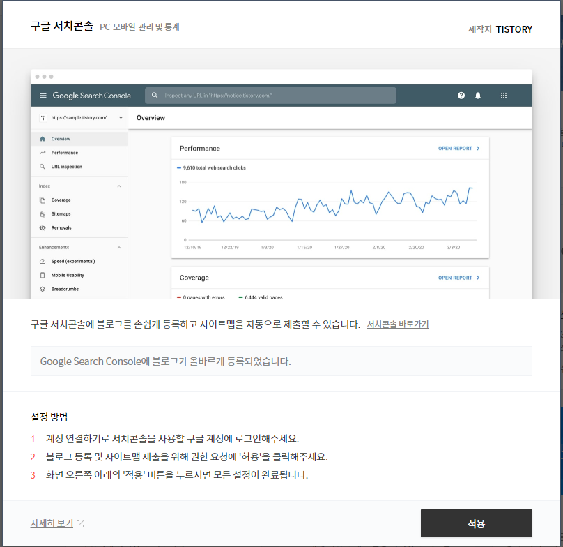 "Google Search Console에 블로그가 올바르게 등록되었습니다" 문구를 확인하고 적용 버튼을 누르면 된다.