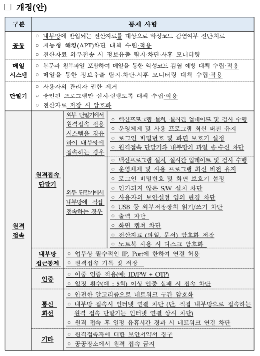그 밖에도 업무용 시스템 접속 시 OTP 등 2-Factor 인증이나 접근통제의 적용, 통신 구간 암호화, 기록관리 등의 내용을 포함하고 있다. 이 내용은 기존에 망분리 예외 규정 적용 시 참조하던 이른바 별표 7의 내용이 더욱 강화된다고 볼 수 있다.