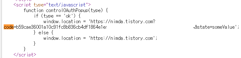 티스토리 API가이드의 Authorization Code 부문을 보면 "인증 요청 및 Authentication code 발급" / "리디렉션 처리" / "Access Token 발급" 의 세단계로 나뉘어져 있는것을 알 수 있다. 예전에는 Implicit 방식으로 Access Token 페이지로 바로 이동했다면 해당 방법은 없어지고 "리디렉션 처리" 부분에서 Code 값이 추가되어, 이 Code 값으로 다시 Access Token 값을 발급받는 페이지로 이동하도록 바뀐 것을 알 수 있었다. 실제 URL을 확인하여 접속해보면 Authentication code를 확인하는 허가하기 버튼을 누르는 페이지를 확인이 되었다. 어차피 허가하기를 클릭하는 부분도 결국 링크이동이기 떄문에 소스보기를 통해 code 값이 존재하는 부분을 찾을 수 있었다.