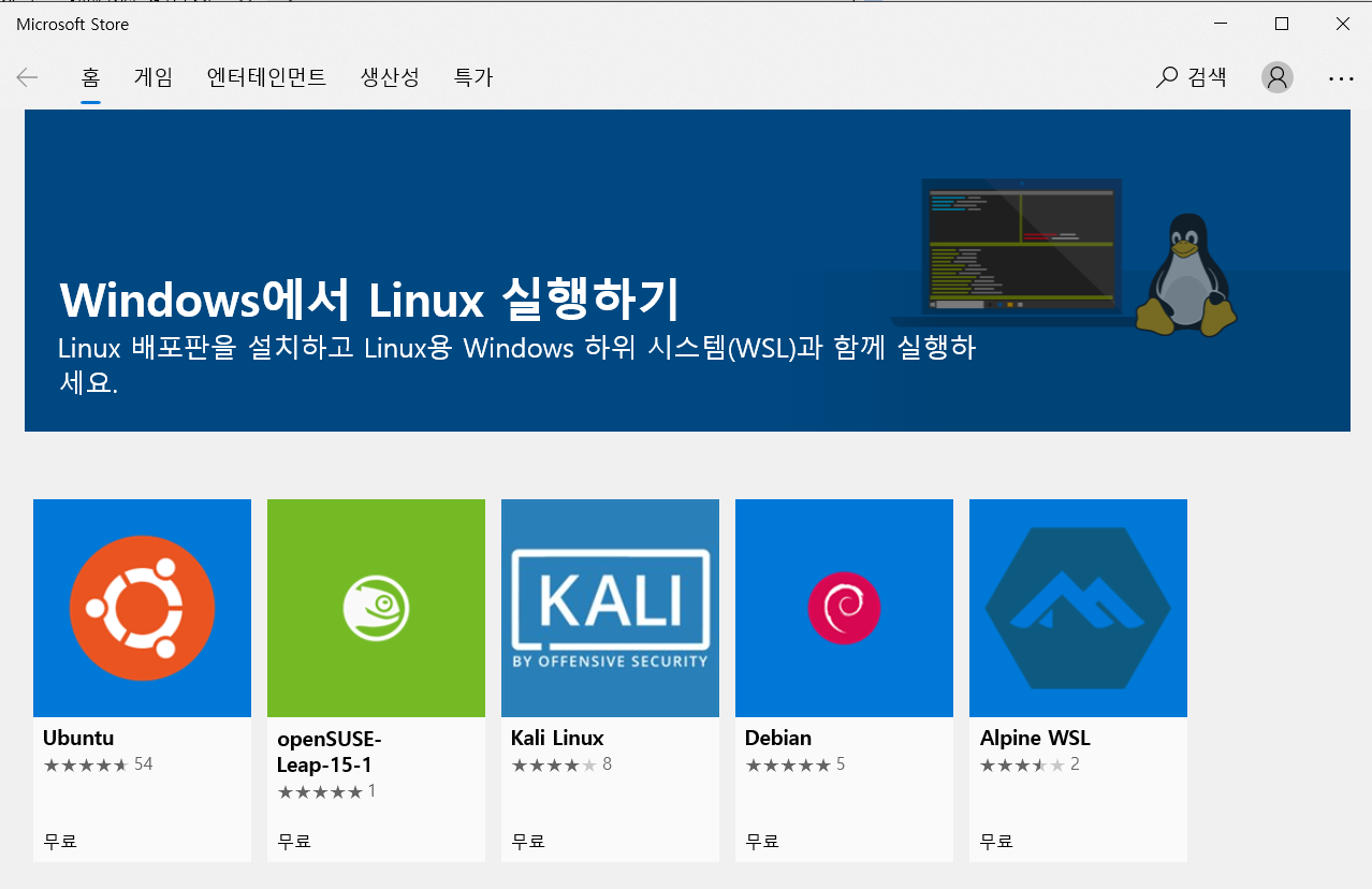 설정이 끝나면 Microsoft Store에서 설치할 Linux 선택하여 설치를 해주고 계정 설정등을 진행해주면 다른 프로그램 설치없이 Windows에서 바로 Linux를 사용 할 수 있다.